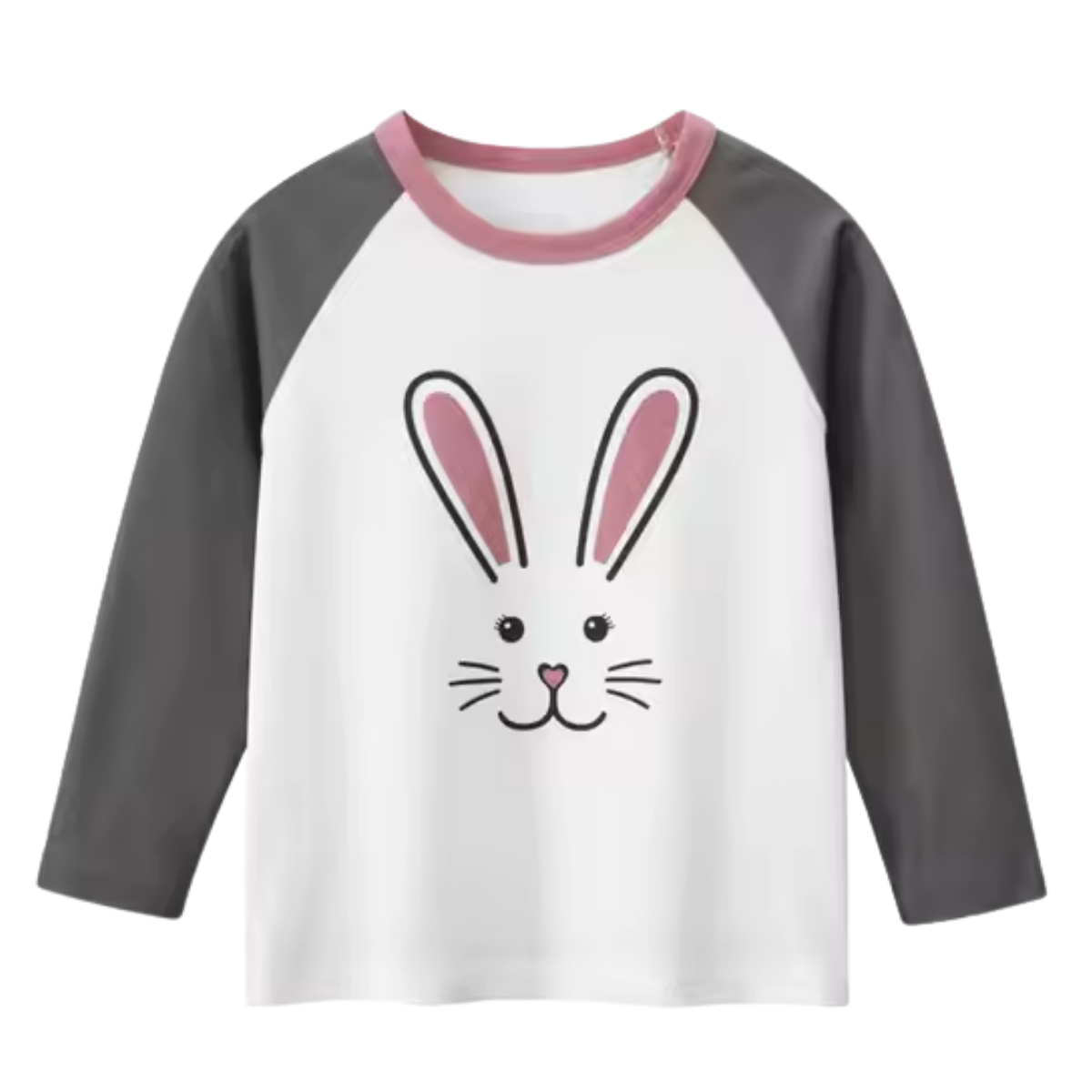 La Remera Conejo Carita Sonriente es una prenda pensada para brindar comodidad, estilo y dulzura en el día a día de los más pequeños. Su diseño combina mangas raglán en gris oscuro, cuello en tono rosado y un simpático conejito estampado en el frente que enamora a primera vista. 🐇💖
